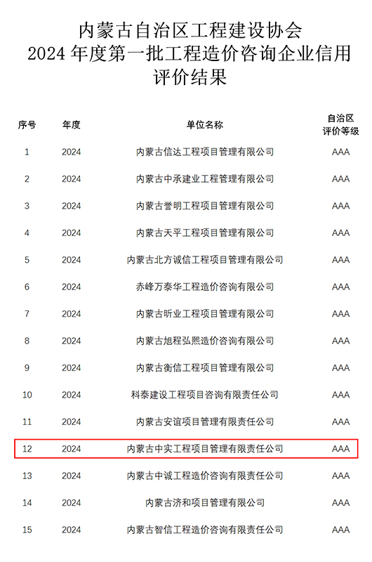 2024-07-3017167 次近期,我公司参加内蒙古自治区工程建设协会组织的“2024年度第一批工程造价咨询企业信用”申报,获得“信用AAA级证书”。我公司成立多年以来,遵循中国工程造价管理协会对造价咨询企…